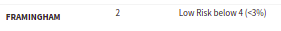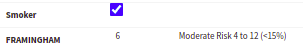- The Framingham score was impacted when the smoker box was ticked. Before the box was ticked the risk score was Low Risk below 4. When the box is ticked, the risk score changed to Moderate Risk 4 to 12.