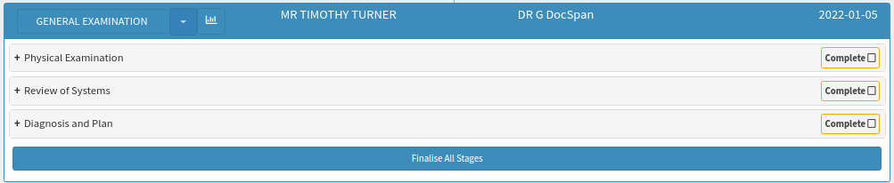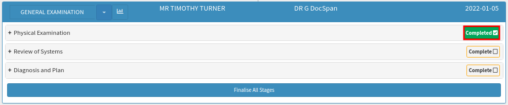 - Click on the Complete button to indicate that the Physical Examination section is completed.
