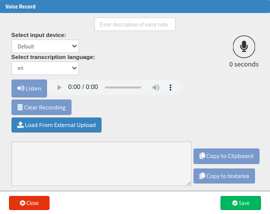 - A Voice Record screen will open, which can be used to make, upload, transcribe and listen to audio recordings.