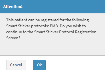 An Attention! pop-up will appear advising the user that the Patient can be registered for the Smart Sticker Protocol linked to the ICD10 code typed in the Diagnosis field.