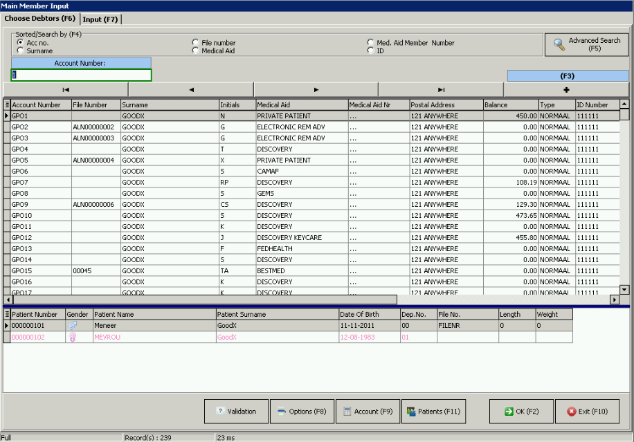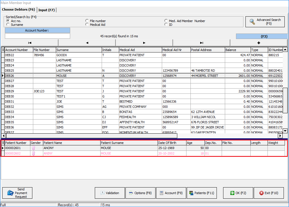 - Displays all patients and dependants linked to the debtor