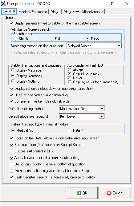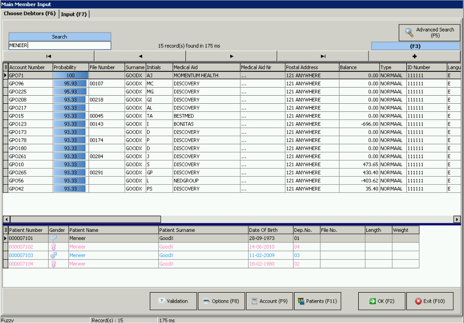 - Fuzzy: This search allows you to search any field on a Debtor - Name, Surname, ID, Medical Aid. It will show all the Debtors where there's a Probability of having the details that you've searched