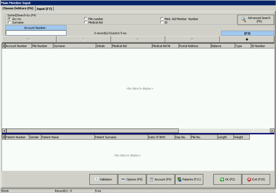 - Shrink: This will show a blank Admittance screen, and will only show the Debtor information when doing a Search from the Main member Input screen