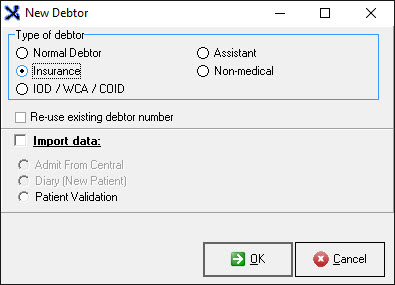 - From the Admittance screen in the MedDebs Click on the + button and choose the Insurance Debtor Type.
