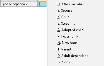 The Dependant Type can be selected from the Main Member Input screen when the Dependants are added to the Main Members file.