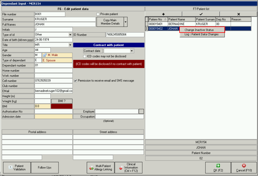 - Right click on the Patient in the Dependent Input screen and choose to Change Inactive Status.
