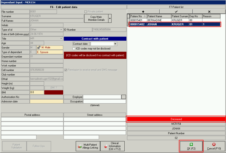 - Patients details will now be greyed out and be marked in red to show "Patient Deceased".