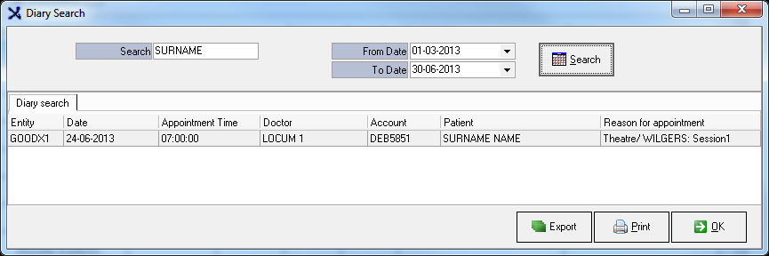 - Double click on the Search result to go to the appointment in the Diary