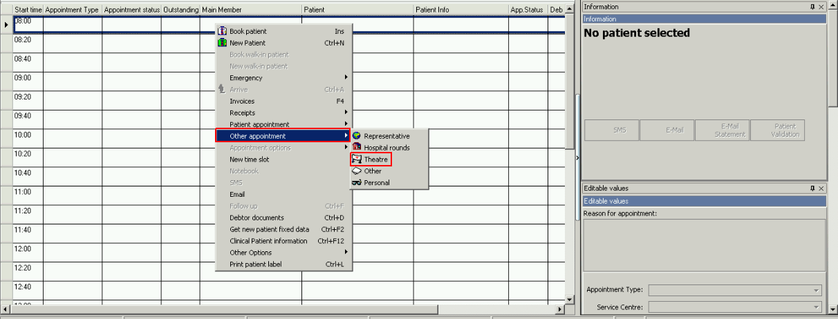 Right click on the selected time slot on the Diary and choose Other Appointment and select "Theatre".