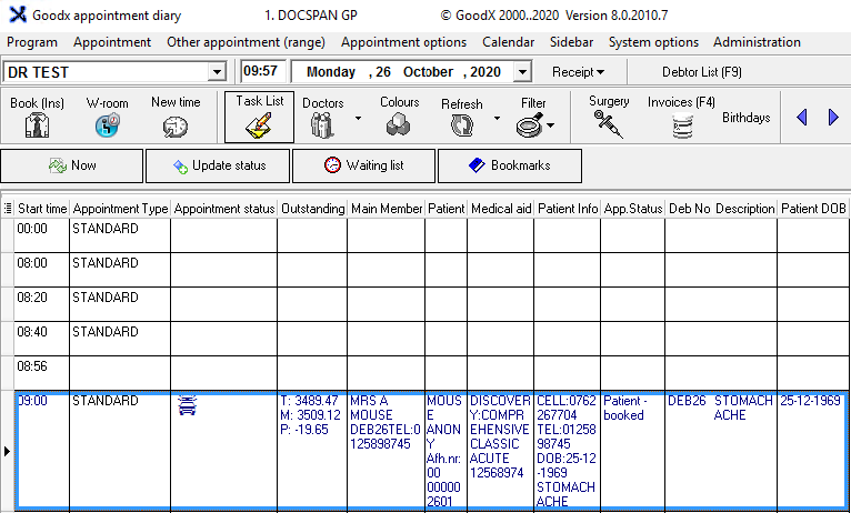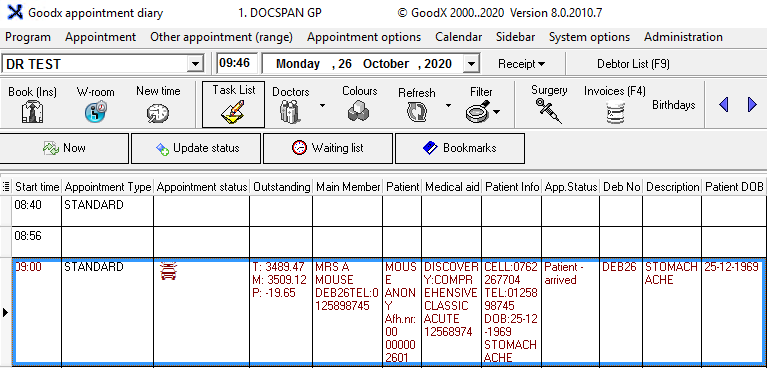 - From the main Diary screen select the patient whom you have accidentally arrived by mistake (text colour is red -depending on your set-up)