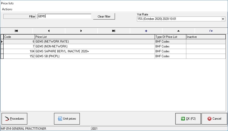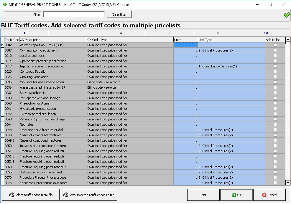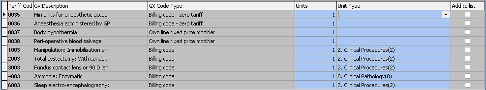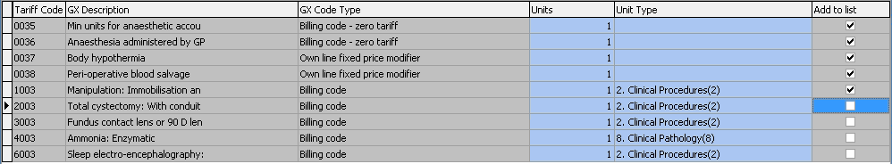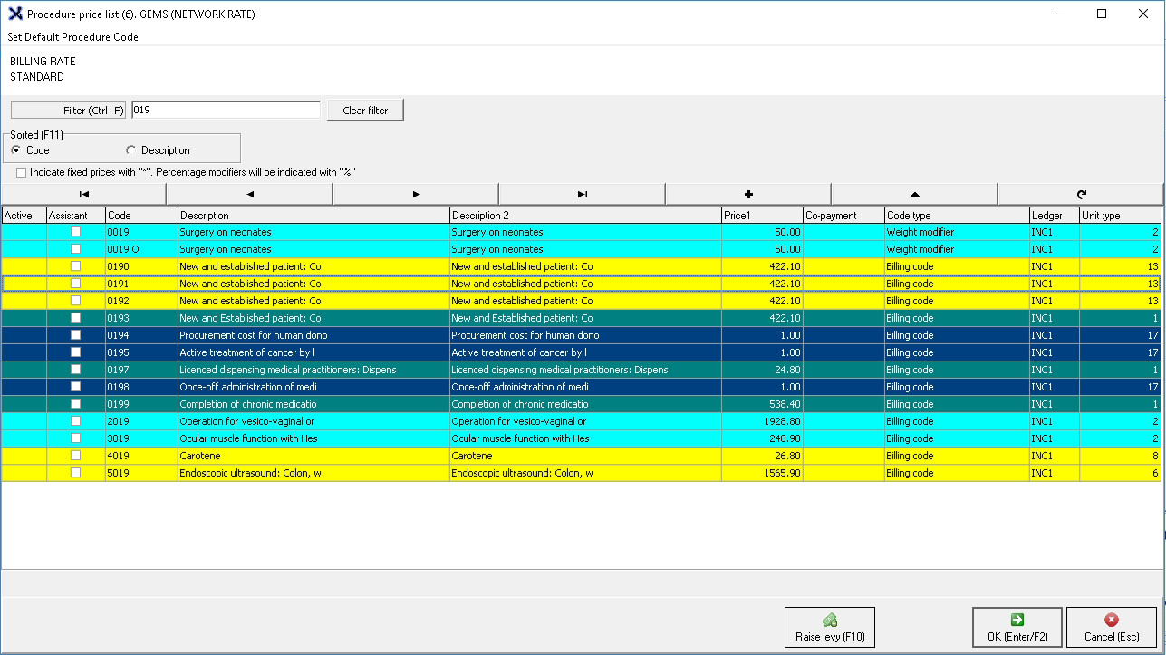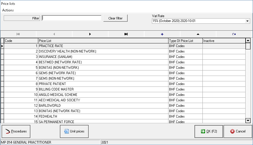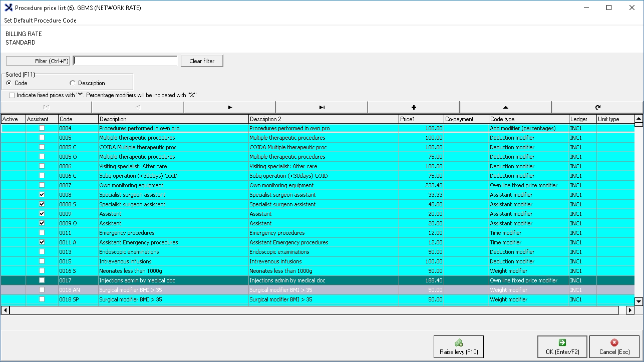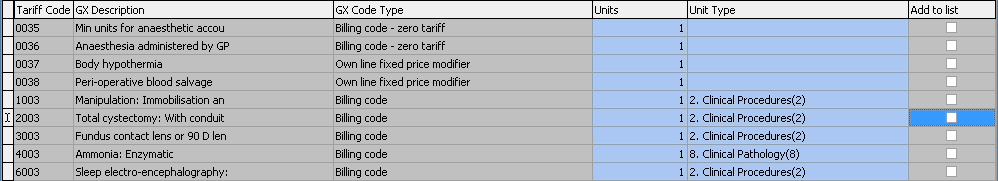 Click on the Procedures button to access the tariff codes on the price list.