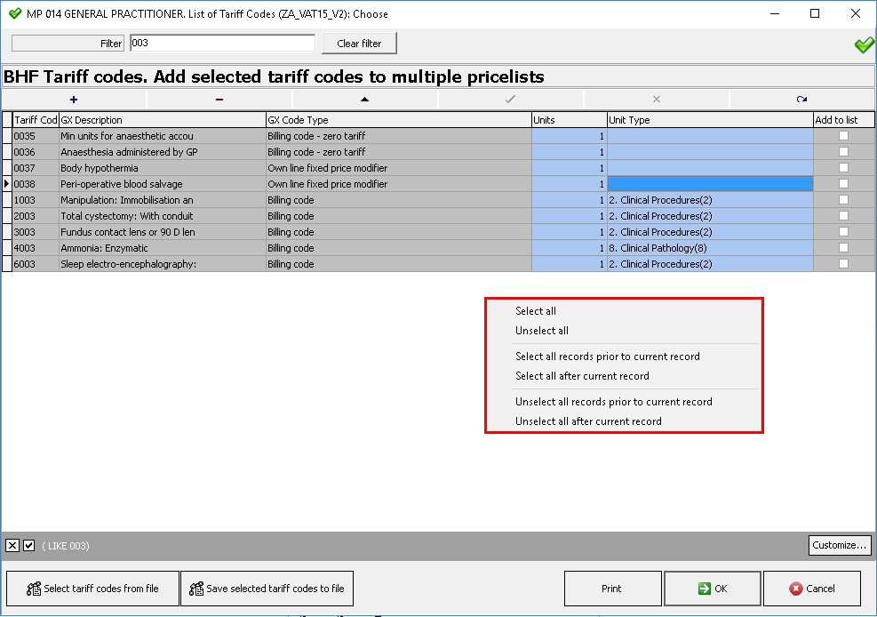 Select all records prior to current record: Will only select the tariff codes above the selected tariff code on the filtered list.