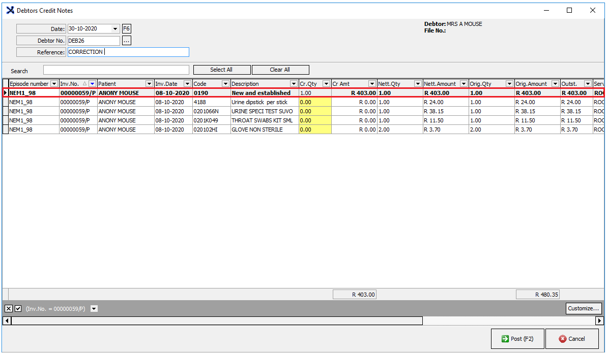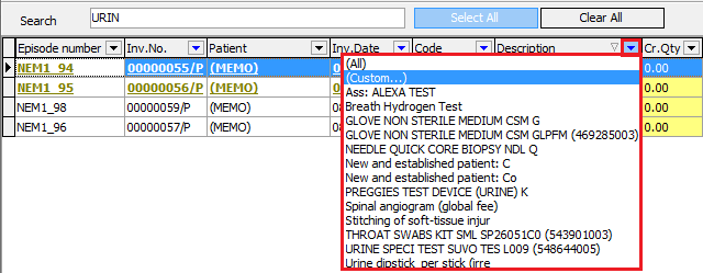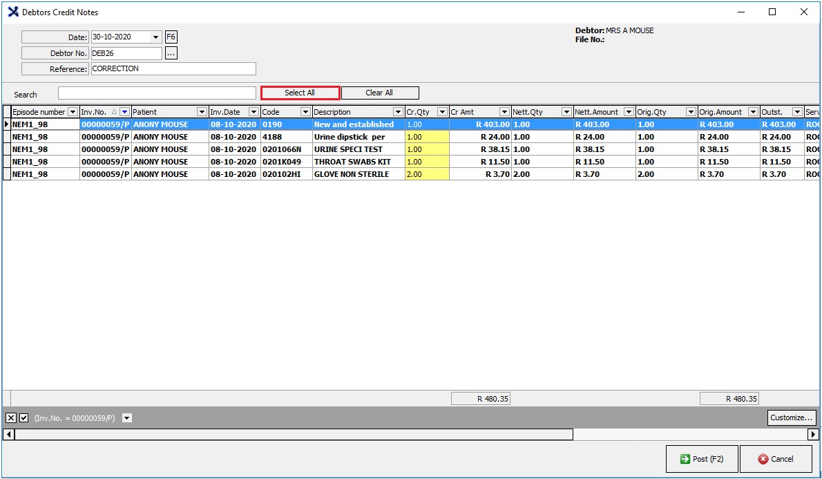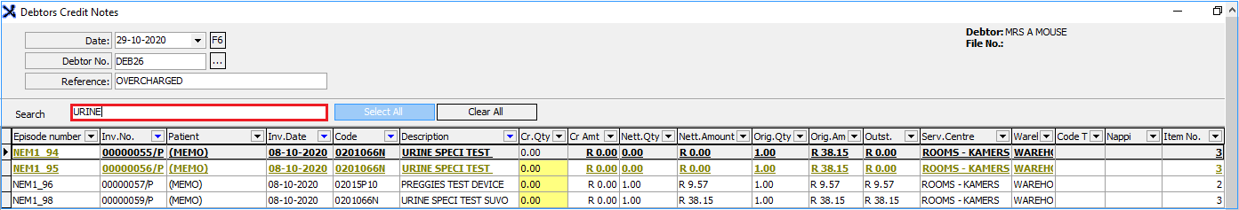 Click on the correct invoice number, and click on the Select All to credit all items on the list