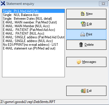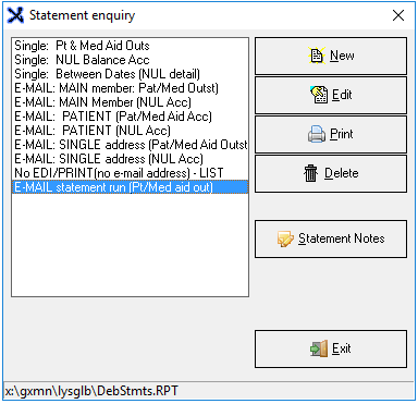 E-MAIL Statement Run (Pat/Med Outst): E-mail statements to ALL Patients (Main Member) who has an outstanding balance, Patient or Med Aid liable.