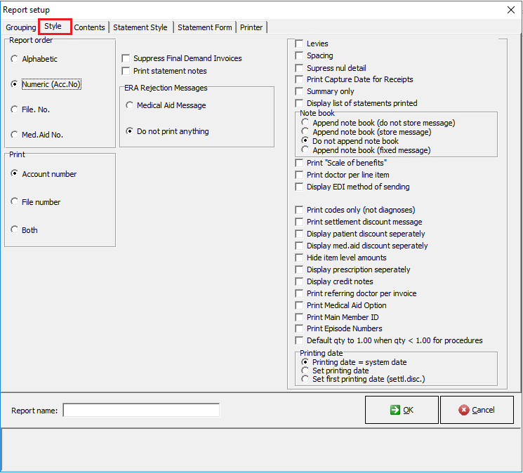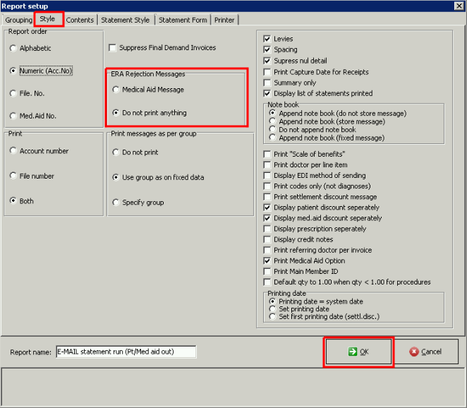 ERA Rejection Messages: You can tick the "Do not Print anything" option, this will hide the message from the Medical Aid on the Statement if the Claim was rejected.