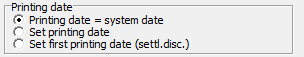 Set First printing date(settl.disc.): Displays the date the statement was first printed for the purpose of the settlement. discount, that if the statement is paid within a certain period a discount will be applied.