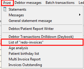 The List of "Redo-Invoices" Report can be found in MedDebs Module.