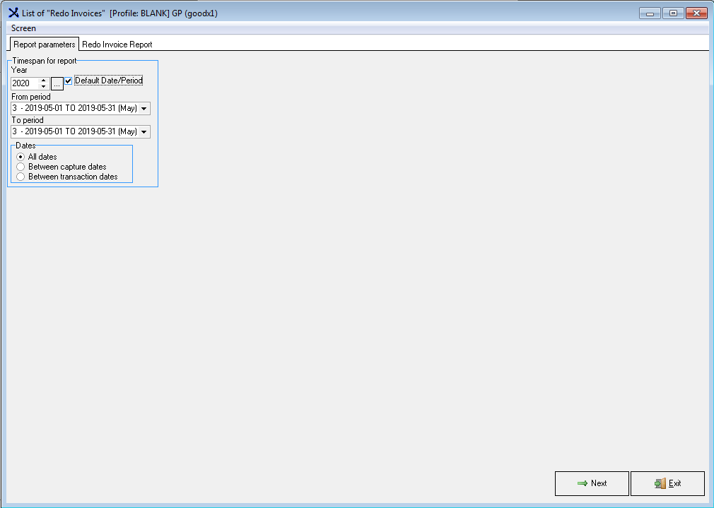 - Select the Type of Dates (From the beginning when the system was used until the date in this section). List of Redo Invoices can be pulled for All dates (the period the Practice has been running for) or between dates.