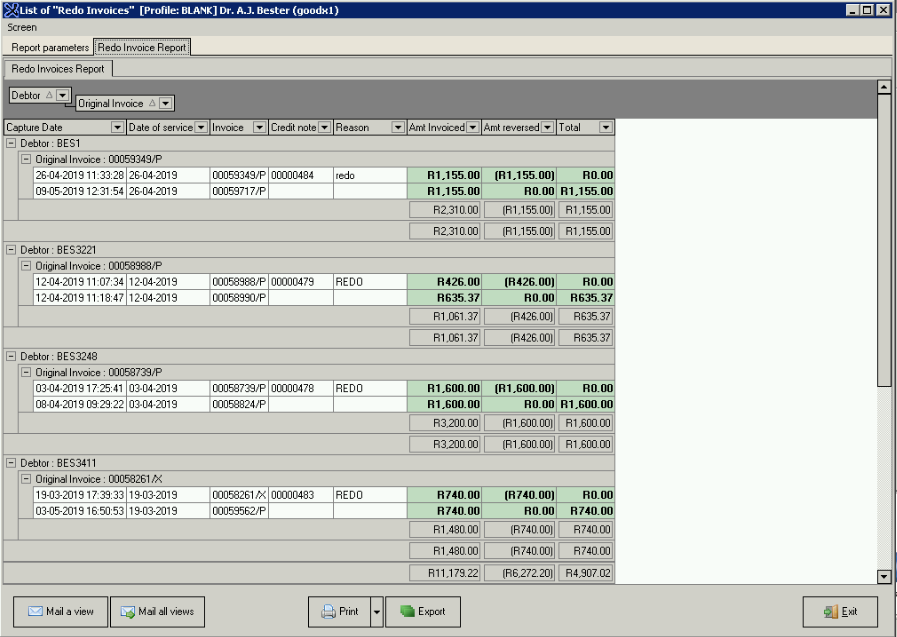 - The Original Invoice and the Redo Invoice will display under the Specific Debtor with all the details of the Invoice like Amount Invoiced and Amount Reversed.