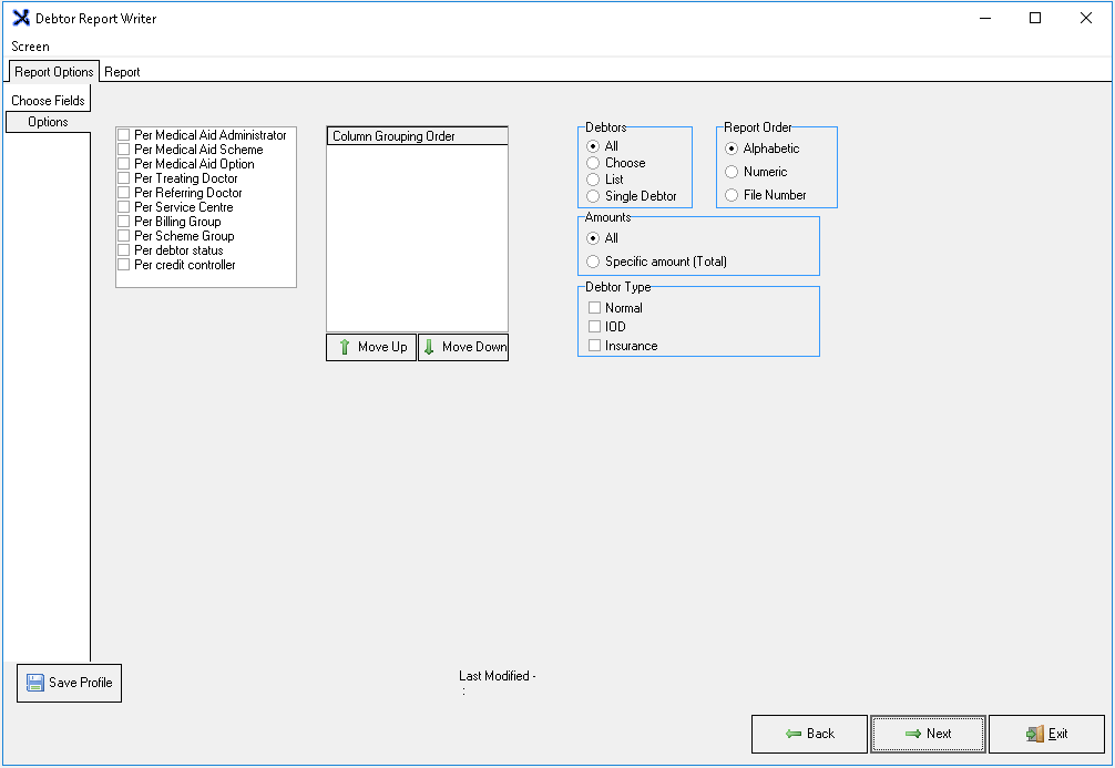 The Debtor Report Writer, Report Options screen will open, in order to set up the new profile.
