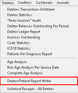 Click on Debtor/Patient Report Writer on the sub-menu.