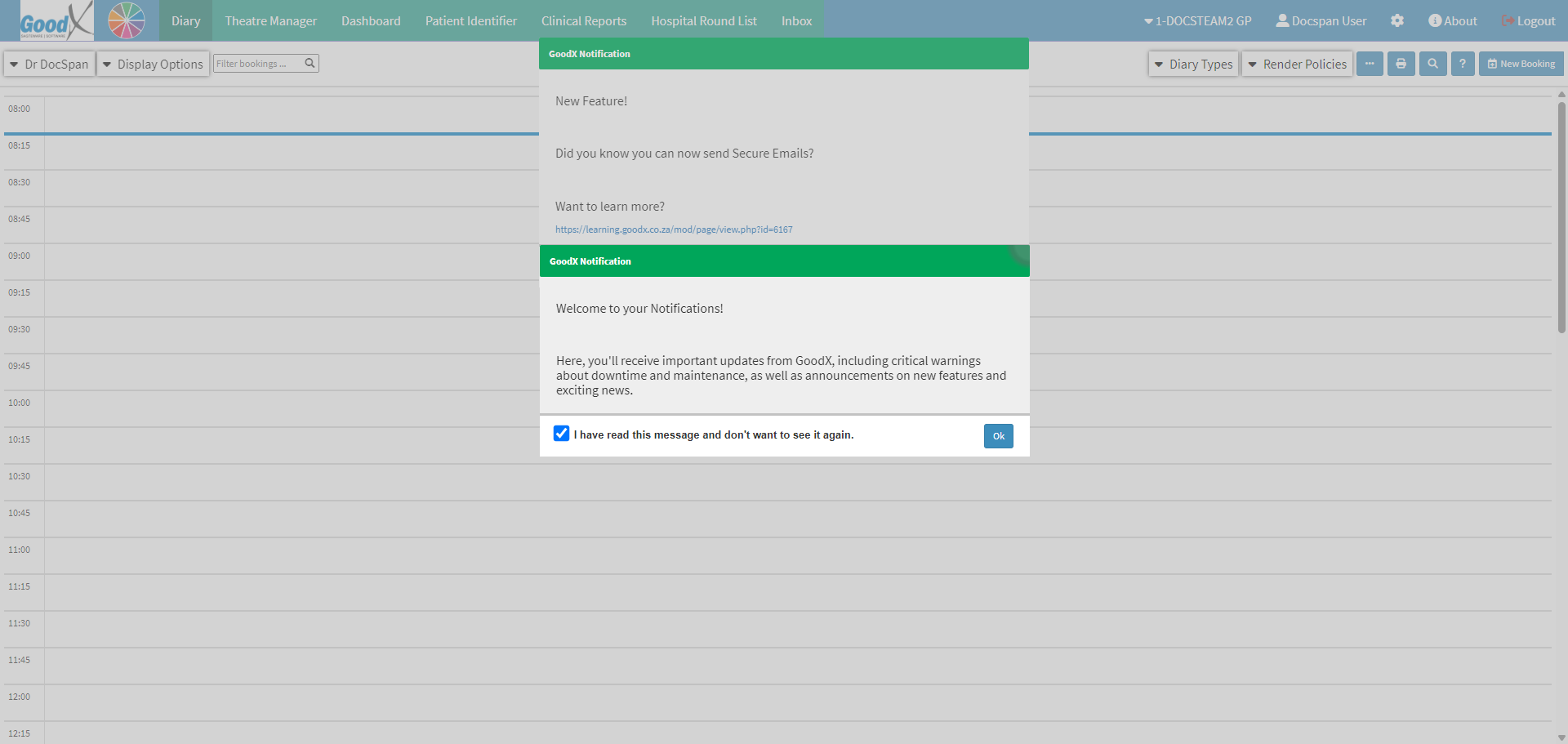 • The Diary screen will open with GoodX Notifications.