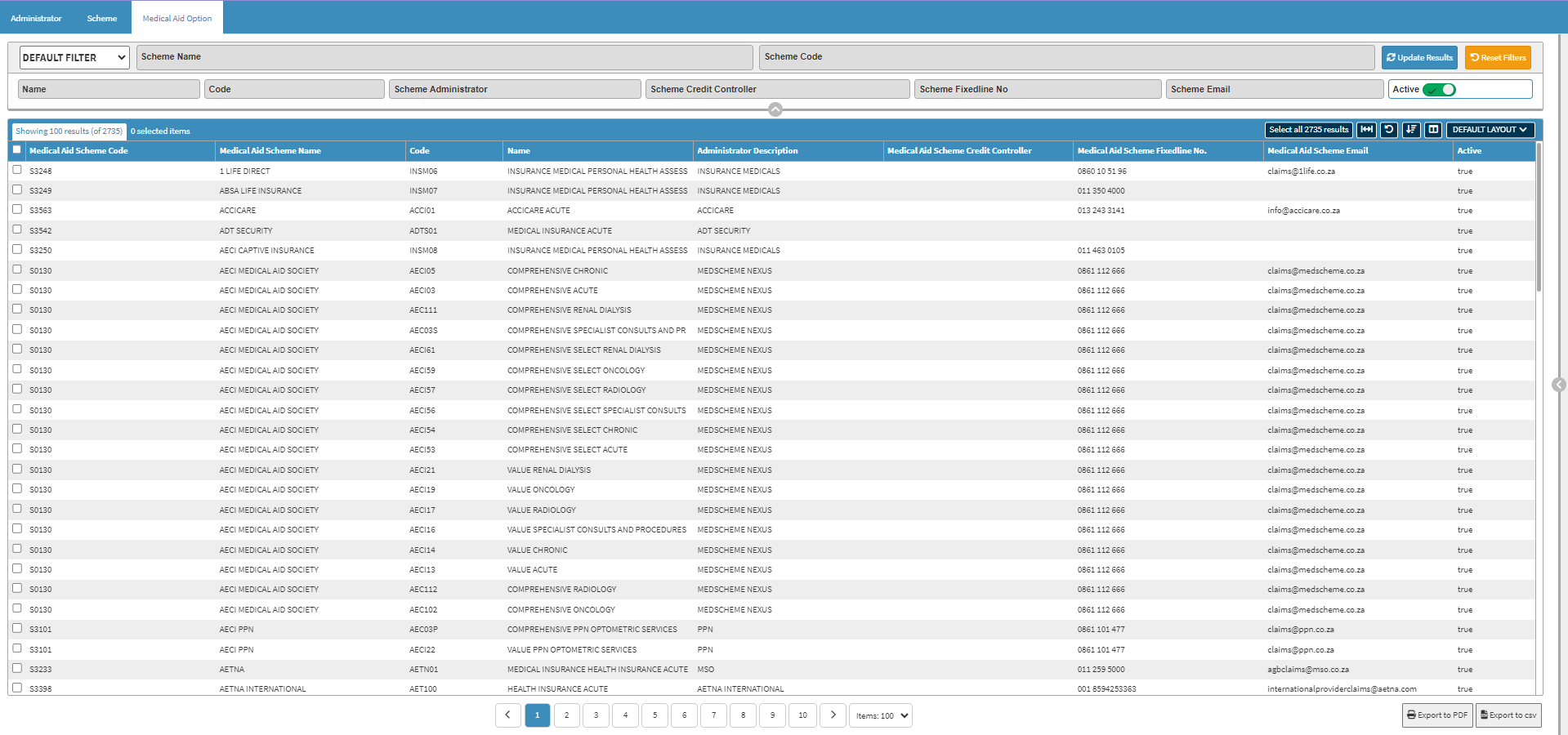 - Click on the Active slider to change the list options from active to inactive, allowing you to include or exclude Medical Aid Options that are no longer active from the list results.