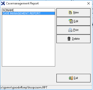 - Click on the Print Case Management Report option to open the Case Management screen. From the Case Management Report screen the user can Edit an existing Case Management Report profile or Create a new Case Management Report profile to view and print.