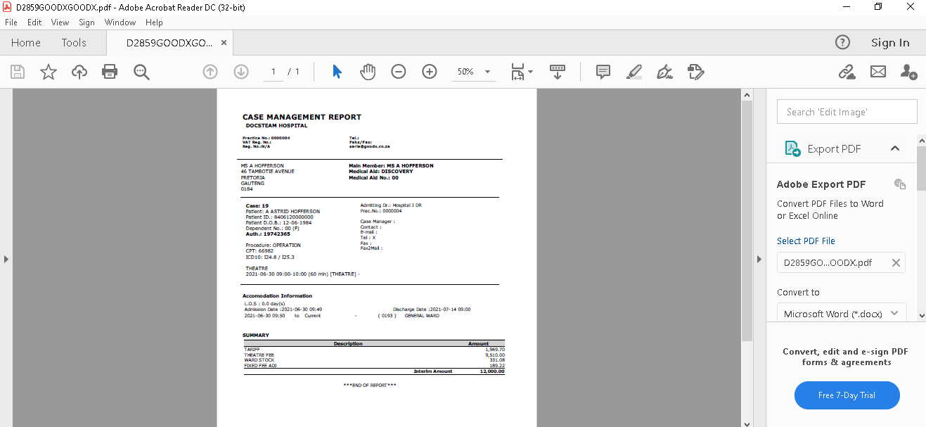 - Print case: When the user clicks on the Print case, the Case Information Form will display in *pdf format. The user can print the Form which displays all the information for this specific case. The Case Information Form can be sent to the Medical Aid as an update on the Patients Hospital Admission.