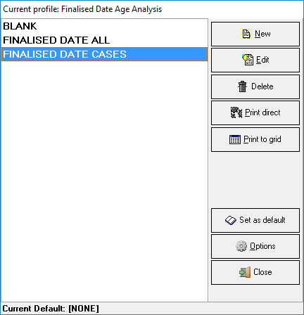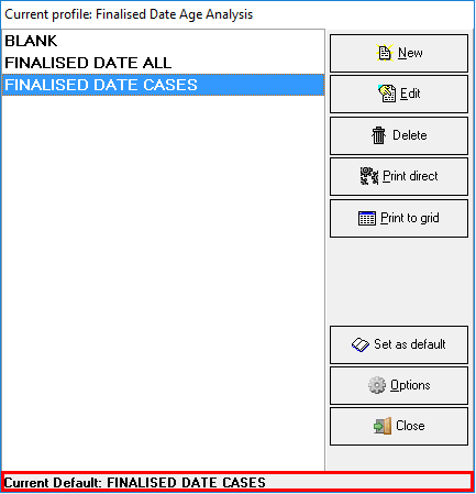 - The selected option will be marked as default and this will be indicated at the bottom of the Current profile: Finalised Date Age Analysis screen.