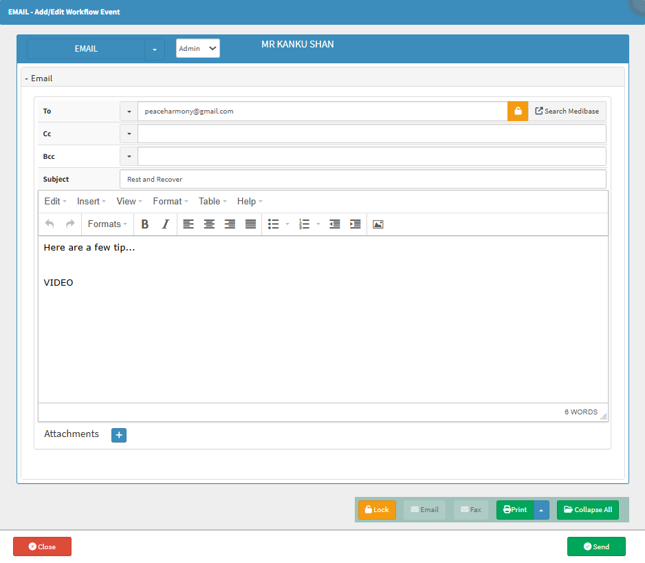 Click on the Send button to send the email to the desired recipient and exit the EMAIL - Workflow Event screen.