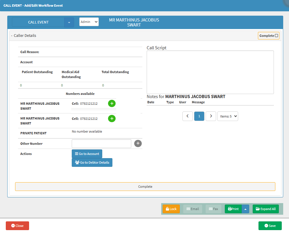 The Dial button opens the Call Event screen, where you can log, prepare for, or follow up on a phone call with a Patient, Debtor, or relevant contact. This screen displays available contact numbers, account information, outstanding balances, and provides space for call notes and feedback. While it does not initiate the actual phone call, it acts as a structured workflow for managing telephonic contact.