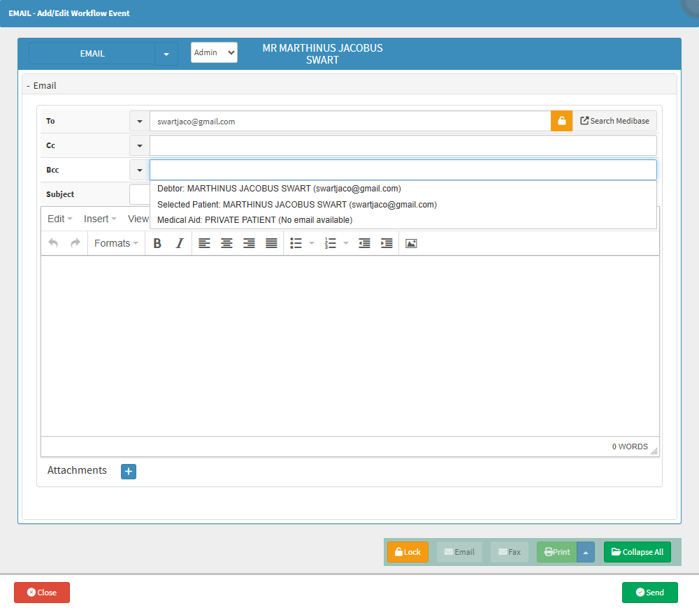 The Email button opens the Email Add/Edit Workflow Event screen, pre-filled with the Patient's or Debtor's email address. You can use this to send an email directly from the system without needing to copy details manually. This is useful for sending reminders, Invoices, Statements, Account Queries, or general communication efficiently.