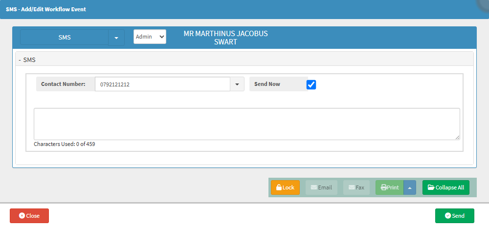 - For more information regarding the SMS Add/Edit Workflow Event, please refer to the user manual: Send an SMS.
