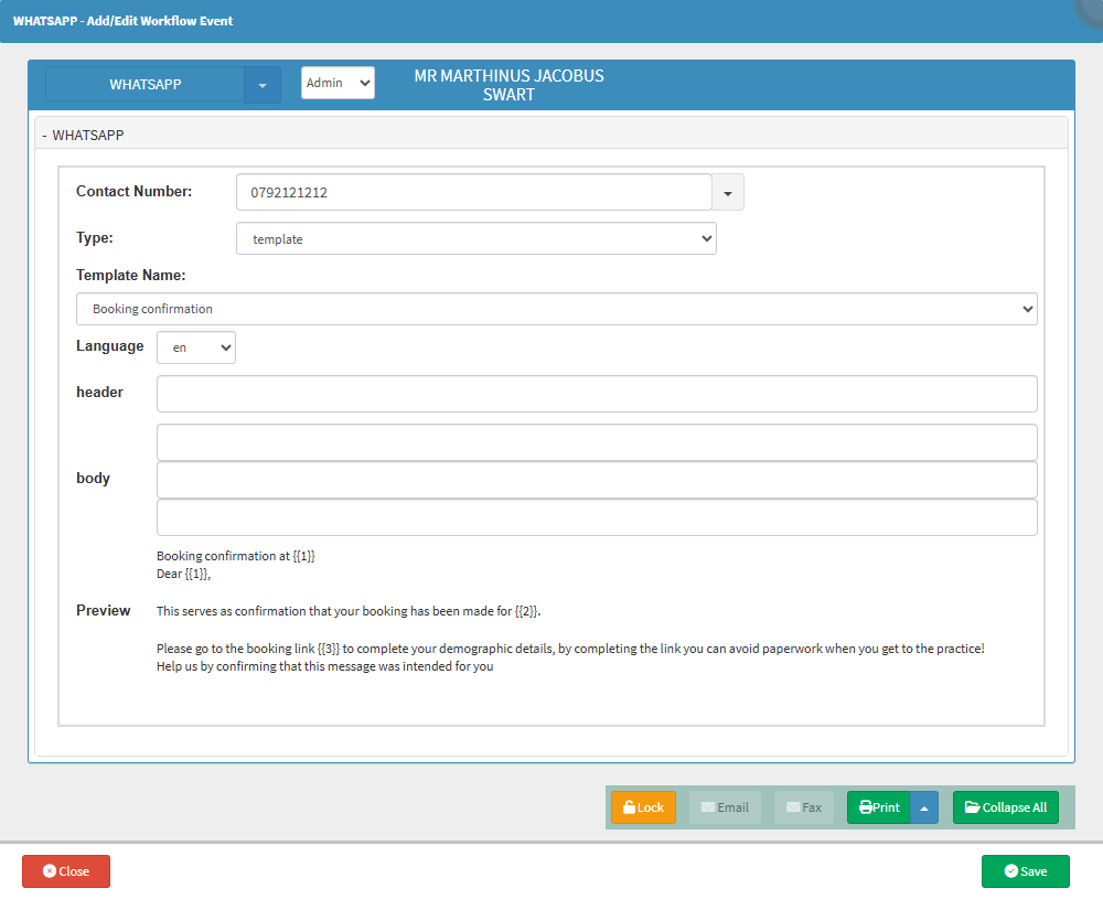 The WhatsApp screen allows you to send a structured, templated WhatsApp message to a Patient, Debtor, or relevant contact directly from the system. This simplifies Patient communication by automating the sending of pre-approved WhatsApp messages for common interactions, like booking confirmations, images or documents. It saves time, ensures consistency, reduces manual typing errors, and provides a professional, traceable communication method.