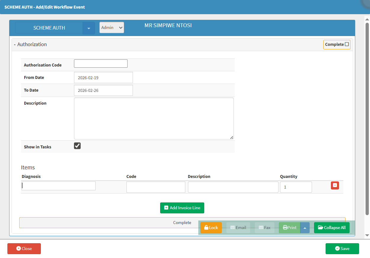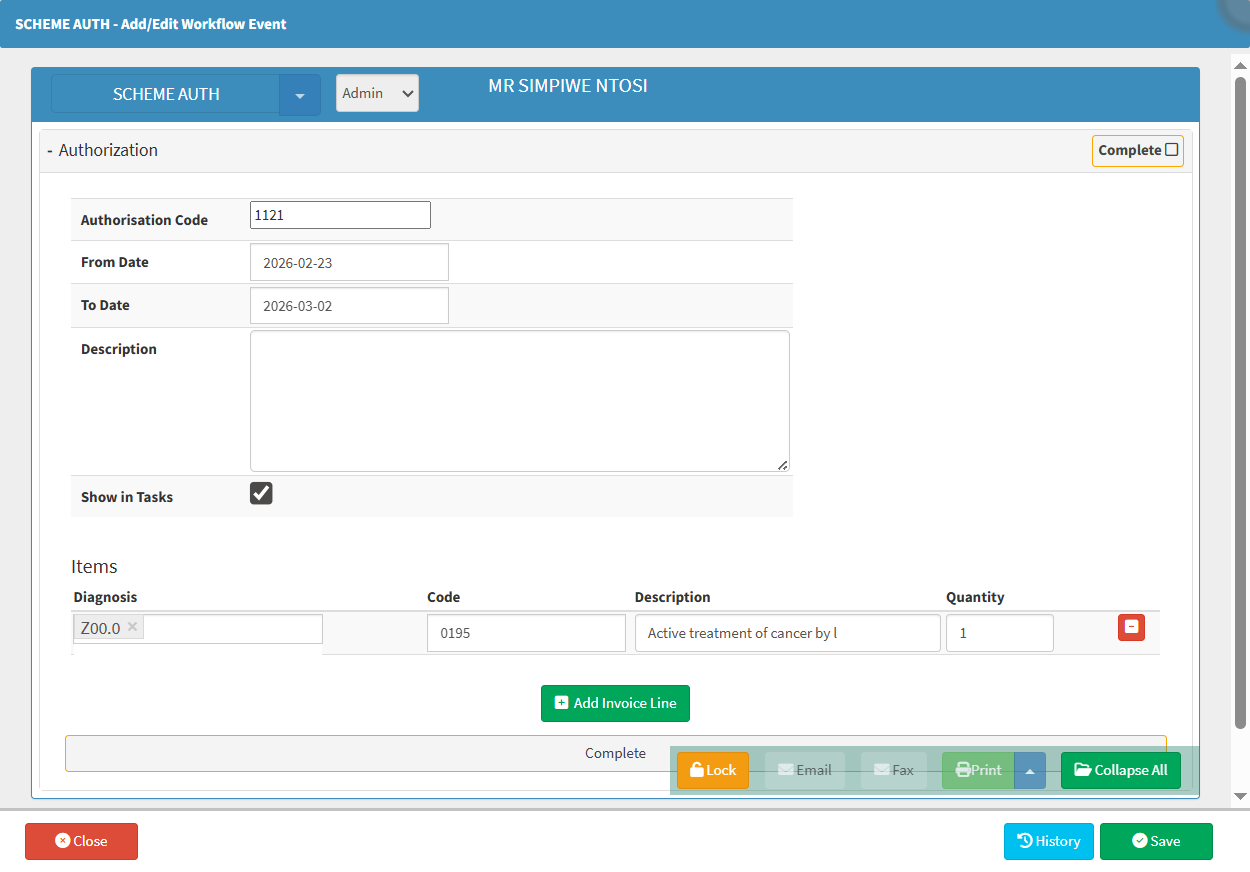 - Click on the Authorisation Code field to enter the Authorisation Number obtained from the Medical Aid.