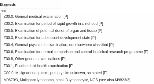 - Click on the Diagnosis field to enter the diagnosis code; the list will shorten as you type.