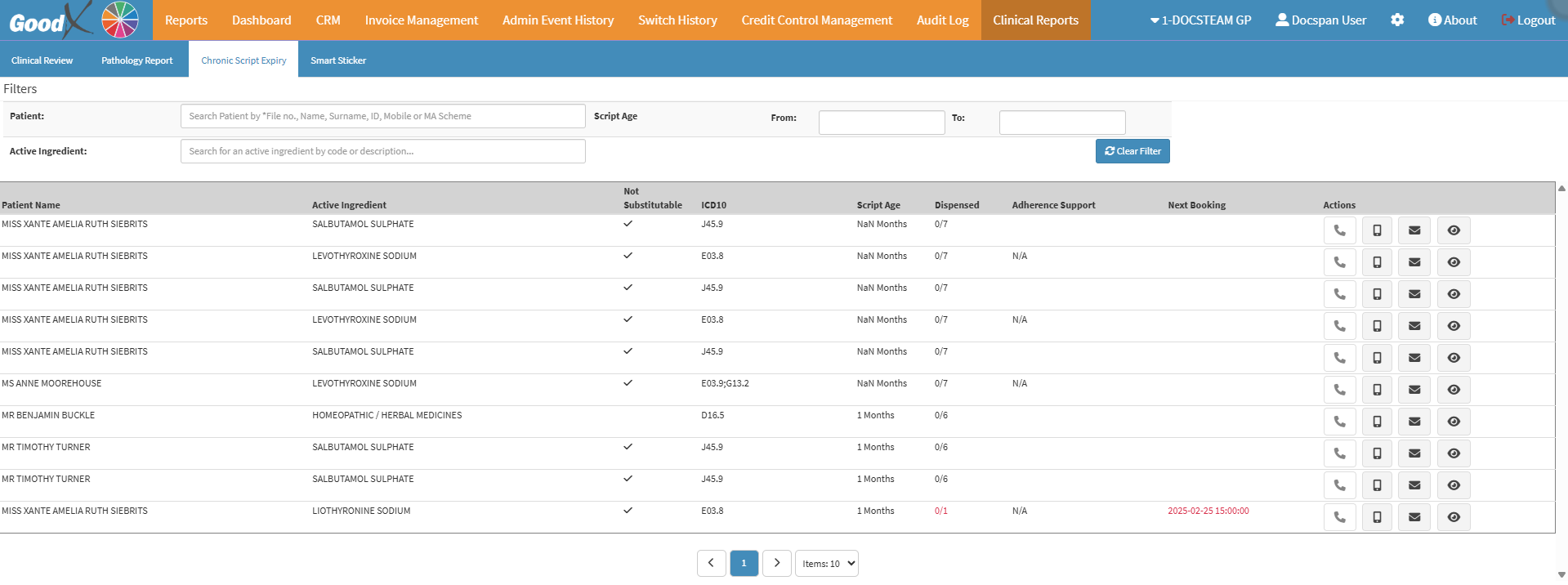 The Chronic Script Expiry feature is essential for tracking when long-term prescriptions are nearing their renewal date. This allows the Practice to proactively follow up with Patients and Practitioners, ensuring treatment continuity without delays. By using this function, users can easily view upcoming script expiries, streamline repeat prescription processes, and maintain accurate clinical records. Staying on top of these expiries helps the Practice provide consistent care while avoiding last-minute prescription issues or interruptions in medication schedules.