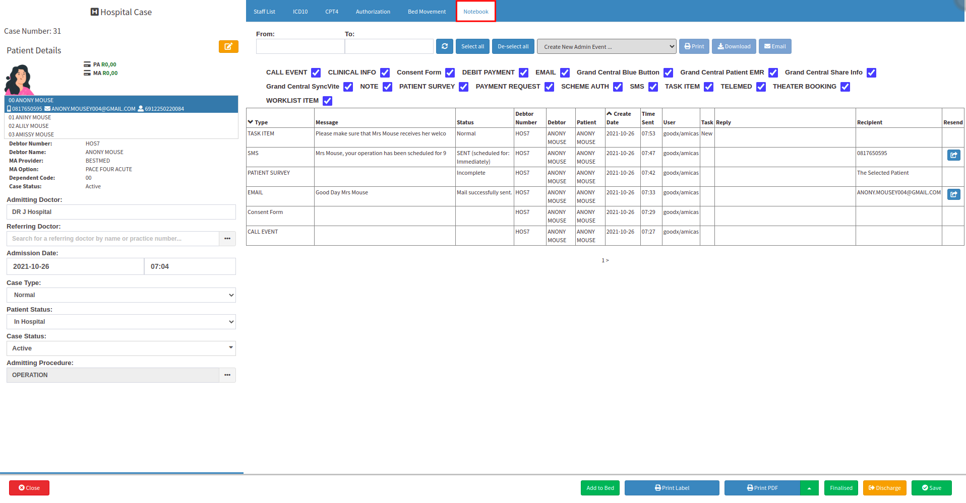 The Notebook per case assists the user to keep track of the communication and accounts for the specific case. SMS's, Emails and Notes relating to the specific case can also be logged. The user is able to log different Admin events on different cases for the same patient and allows the user to see only notes that relate to the current case.