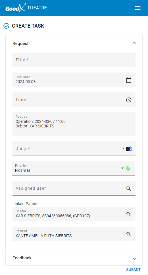 Please Note: The Task has now been Created and can be found in the Notebook of the Patient whose Operation it was Created for, on the GoodX Web App. For more information on how to access the Notebook, please refer to the user manual: Notebook Screen: Use and Navigation.