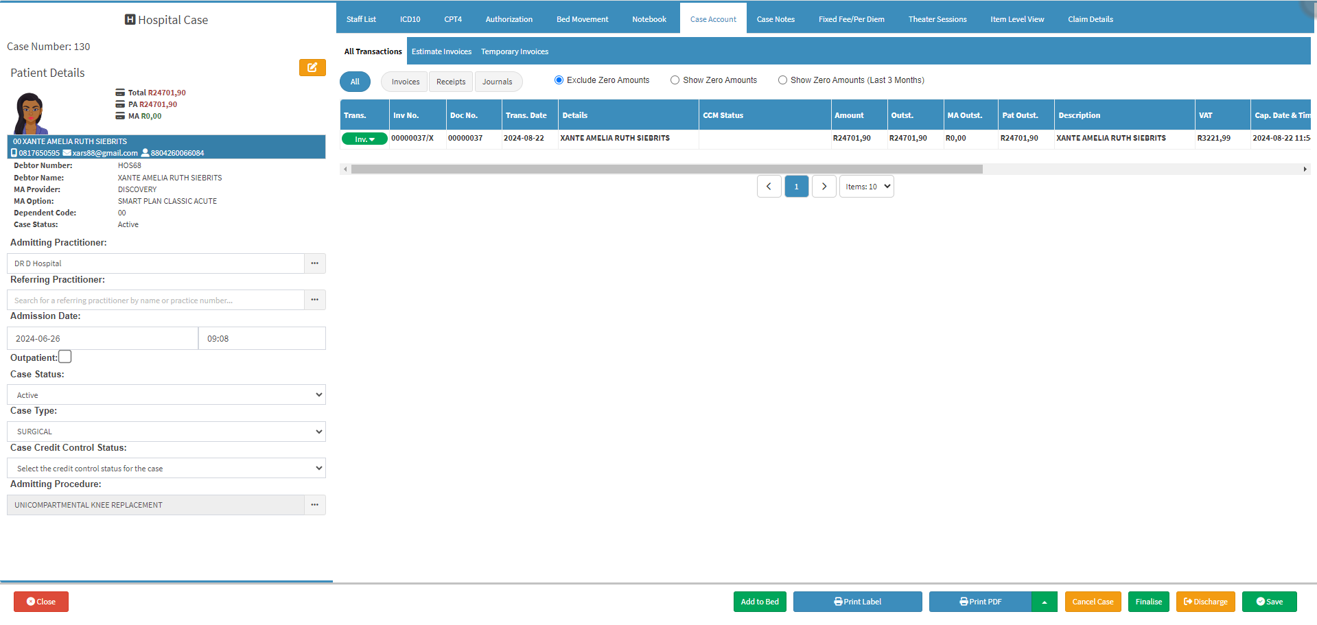 Please Note: The Case Number and Patient Name and Surname information will only display on the Journals screen if you navigate to the Journal from the Case Account screen.