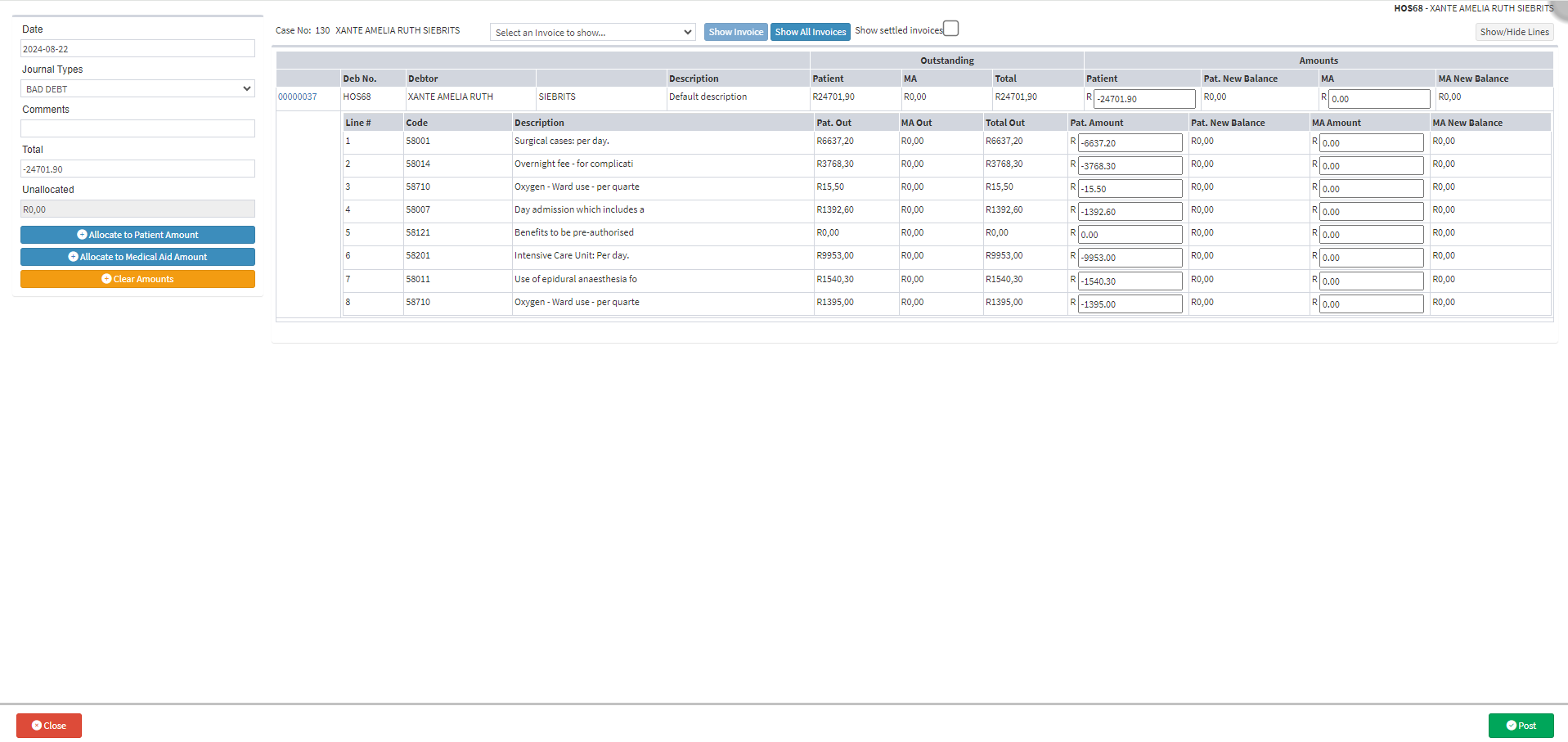 Journals are done to modify a Patient's account by either adding or removing amounts due to a specific reason by assigning these amounts to specific income or expenditure ledger accounts. It serves as a record for various transactions related to Invoices, and should only be used for the following purposes: