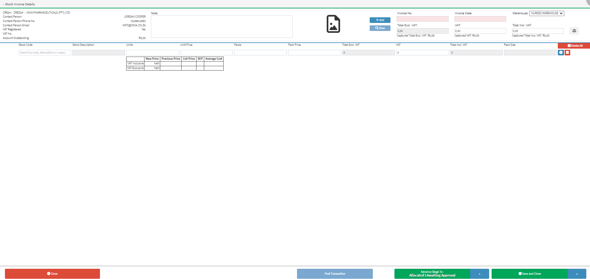 Please Note: The Post Transaction button will be lighter and be inaccessible unless all the information on the Stock Invoice has been entered correctly.