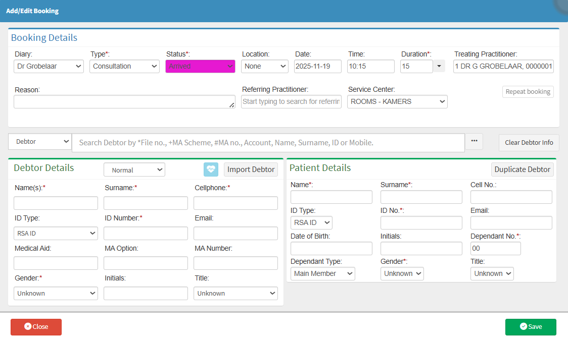 Booking an appointment for a Patient who has never visited the Practice before helps ensure their place in the schedule without needing their full details upfront. Only basic information is required, such as Name, Surname, Contact Number, and ID Number. Once the Patient arrives, their full electronic file can be created and completed with all the necessary details.
