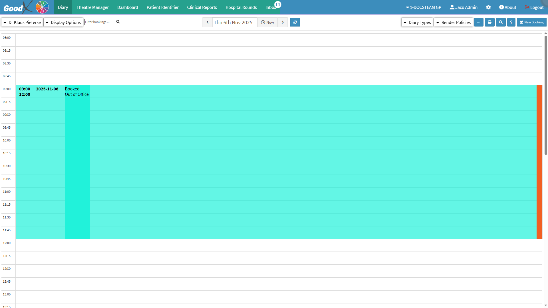- On the Diary screen, the Out of Office booking will be clearly displayed in its allocated timeslot.