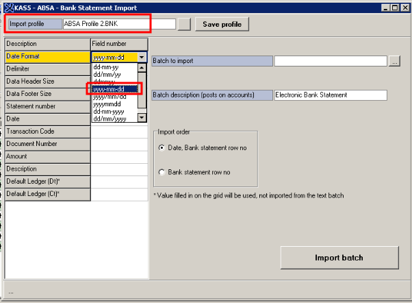 1. Date Format: Click on the dropdown box and select the Date Format as it appears on the Bank Statement E.g.: 2013-04-03 (yyyy-mm-dd)
