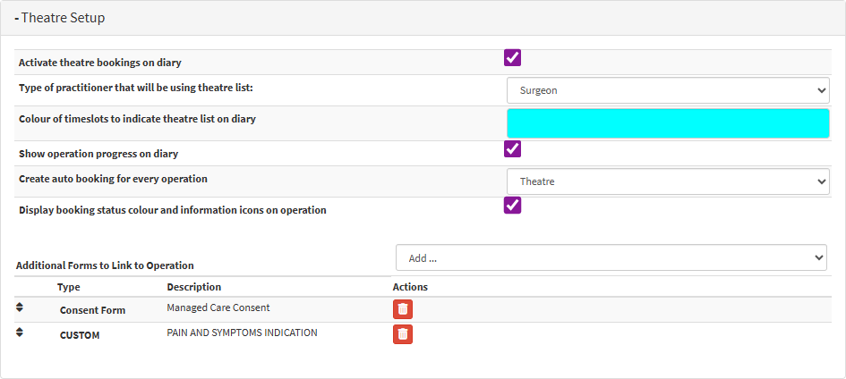 Theatre Setup allows you to customise how theatre bookings are displayed on the Diary and to configure forms that will automatically be added when a theatre booking is created. This ensures that all necessary documentation is linked to the booking from the start. Theatre bookings provide clear visibility of which Patients are scheduled for procedures, while time slots are marked to indicate that the Practitioner is at the hospital rather than at the Practice. By streamlining configuration and display, Theatre Setup supports accurate scheduling, improves organisation, and ensures efficient theatre management.