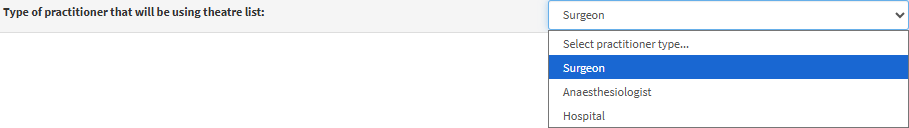Click on the Type of Practitioner that Will be Using Theatre List drop-down menu and choose the Practitioner type that will be using the Theatre Manager.