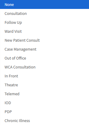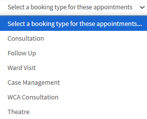 The options available in the drop-down menu are determined by your Practice settings and how Booking Types have been configured. For more information on setting up Booking Types, please refer to the user manual: Booking Type Setup.