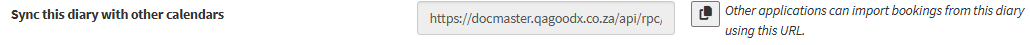 • The Sync This Diary with Other Calendars setting will enable other applications to import bookings from this Diary using the URL in the field.